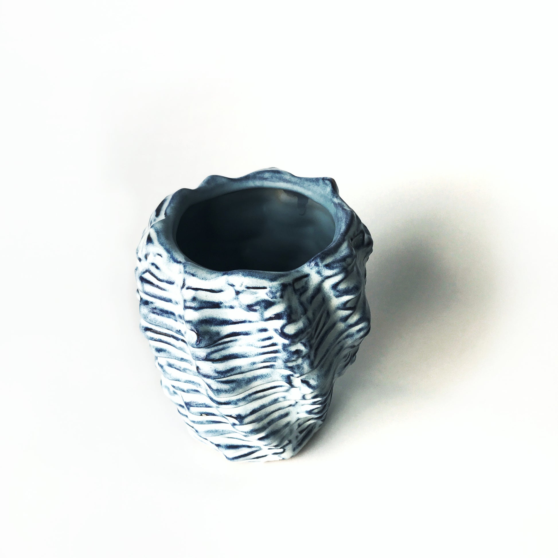 This pretty blue and white vase is sure to look lovely on a nightstand or on a small table. The unusual surface pattern is quite striking--a bit organic and a lovely color that reminds us of the sea. Made of stoneware.