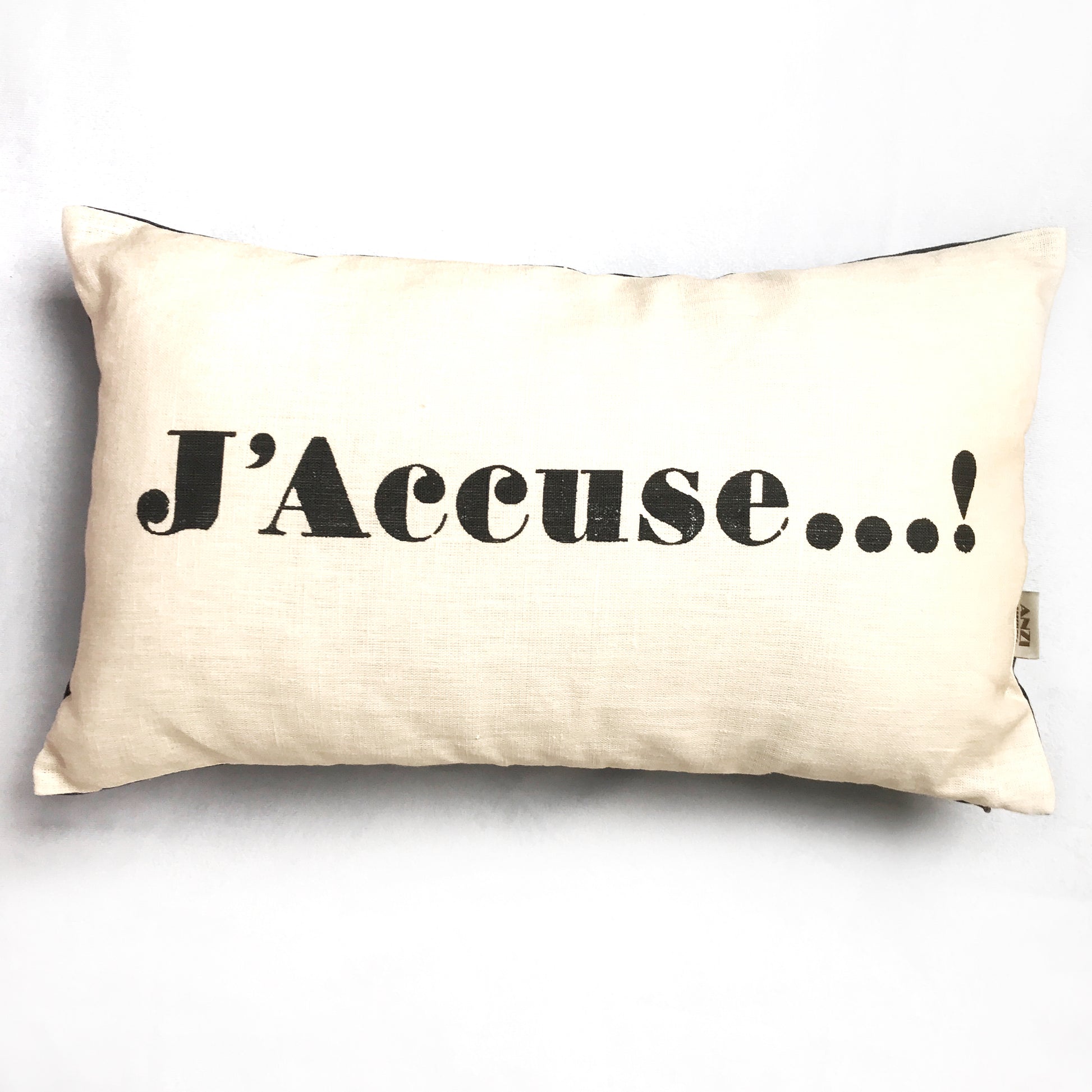 Bring a touch of personality to your sofa, armchair or bed with one of our signature linen cushions. Here the iconic J'Accuse story comes to your living room. The back side is a contrasting black color and details the origins of this phrase. The cushions are printed with Japanese inks on organic linen. They get softer with each wash and develop a lovely texture. Zipper closure. Comes with polyester liner and measures 30 X 50 cm. 100% Organic Linen. Made in Europe.
