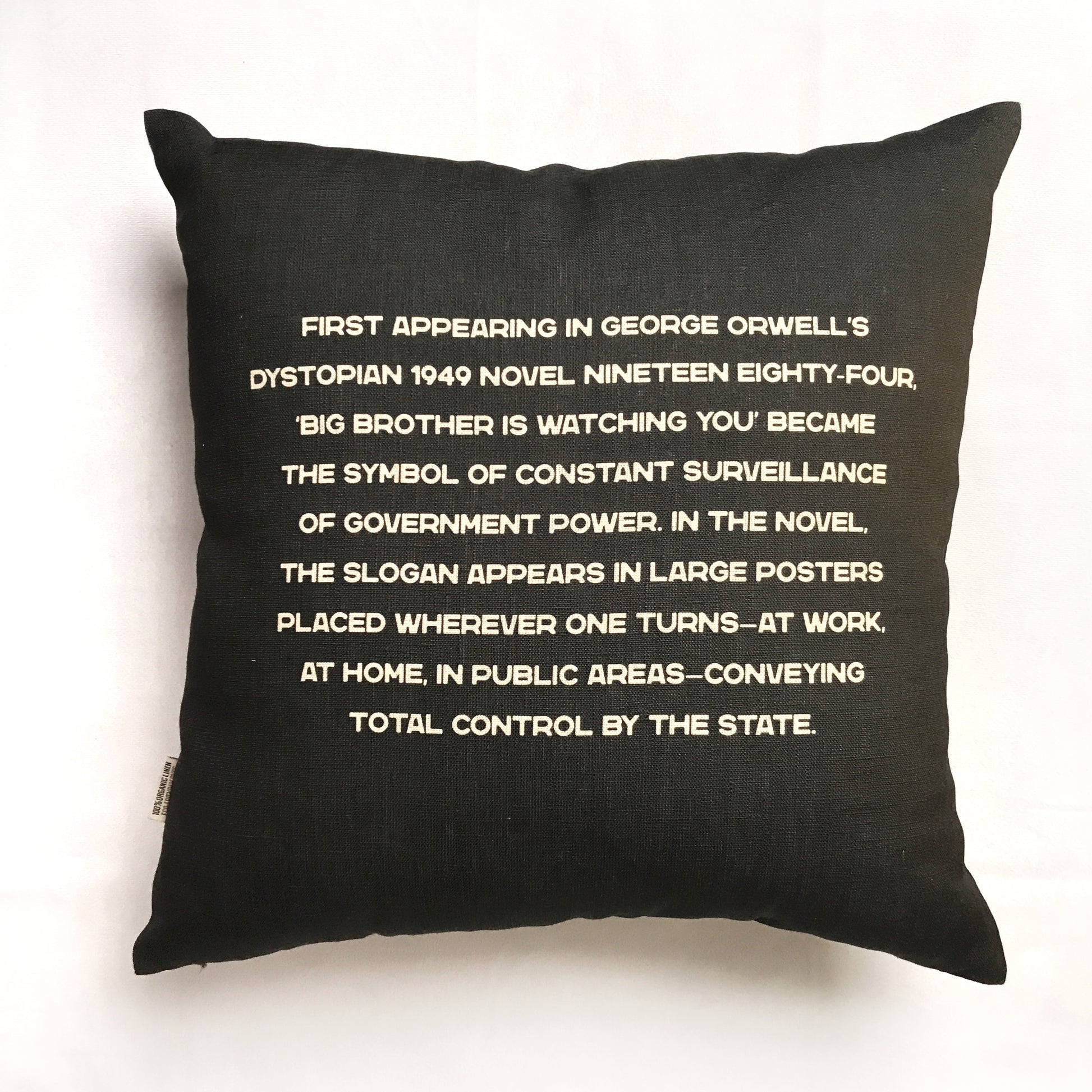 Bring a touch of personality to your sofa, armchair or bed with one of our signature linen cushions. Here the iconic Big Brother comes to your living room. The back side is a contrasting black color and details the story of George Orwell's 1984. The cushions are printed with Japanese inks on organic linen. They get softer with each wash and develop a lovely texture. Zipper closure. Comes with polyester liner and measures 30 X 50 cm. 100% Organic Linen. Made in Europe.
