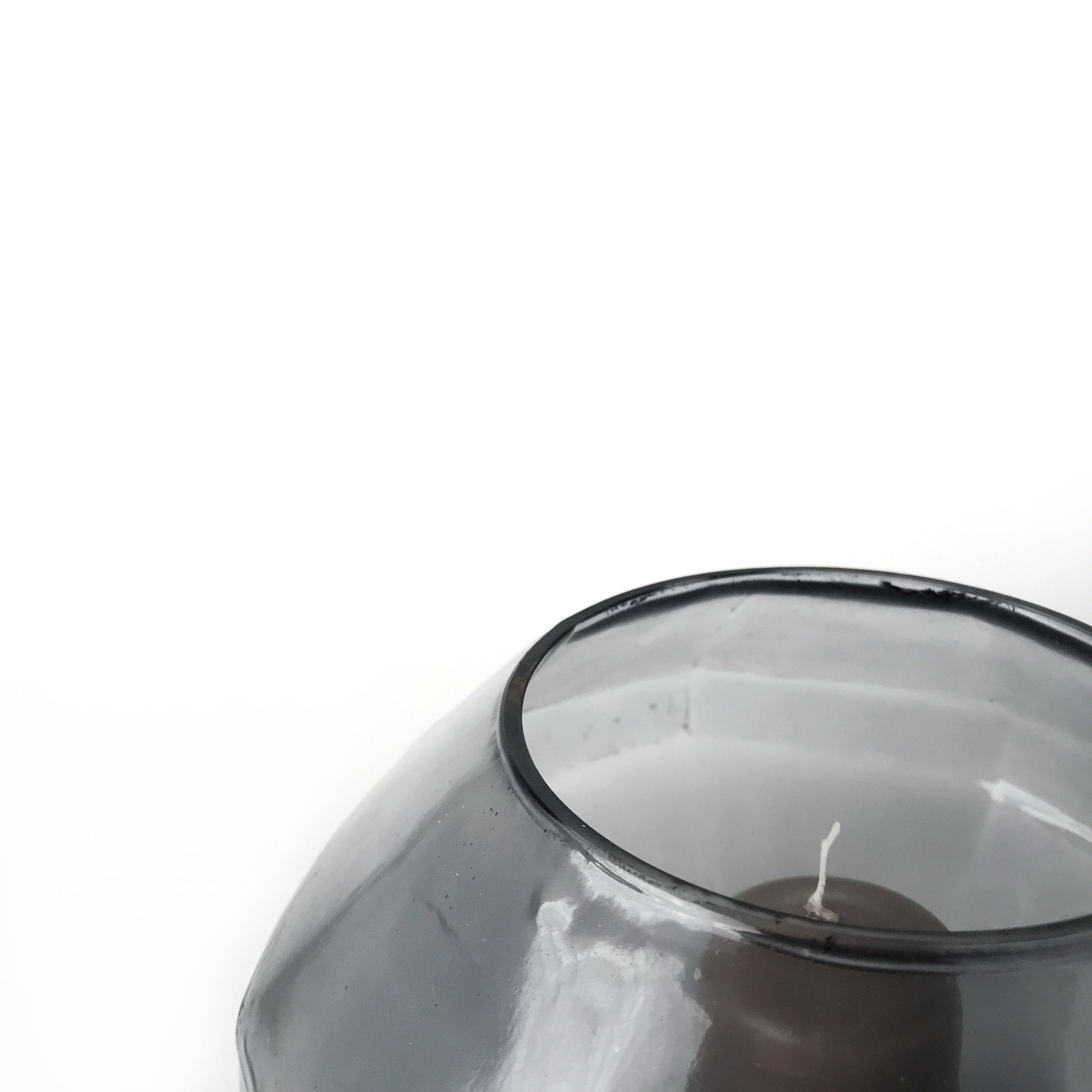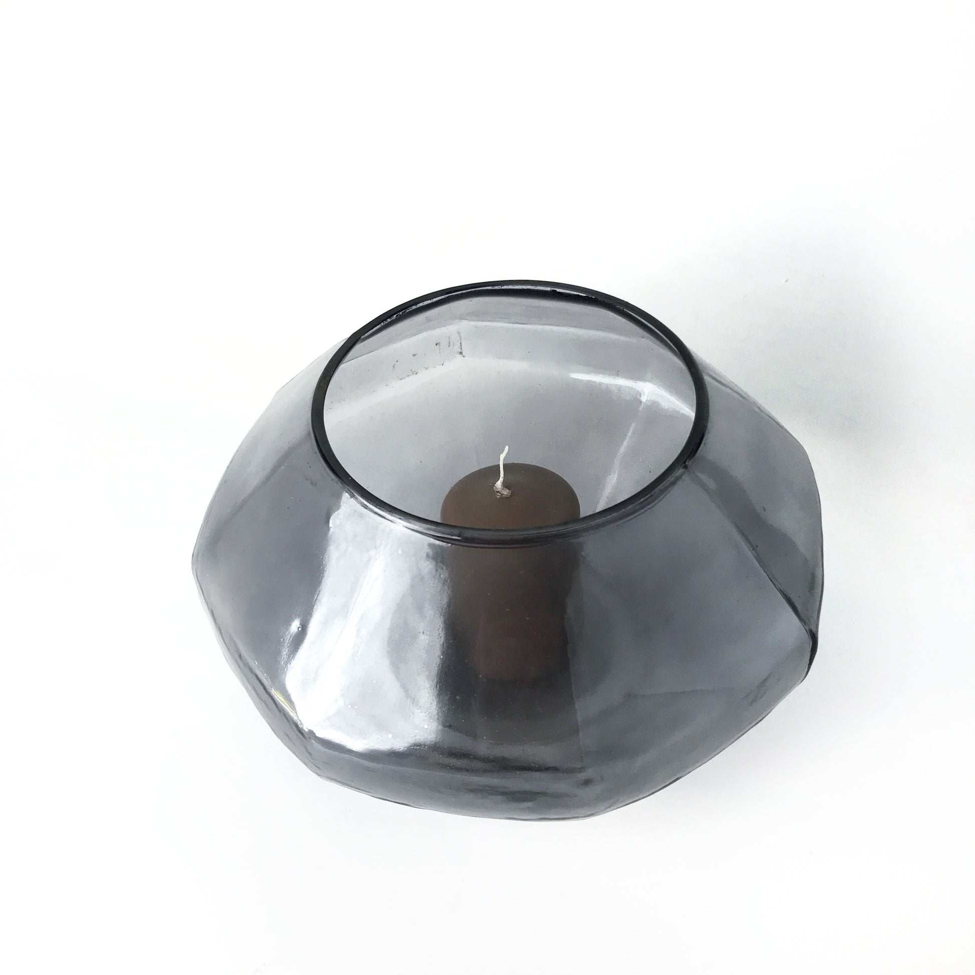 Simple yet elegant, this glass candleholder has a subtle style. Made of a blue-grey colored glass, it looks great plopped on top of a pile of coffee table books or as part of a glamorous table setting.