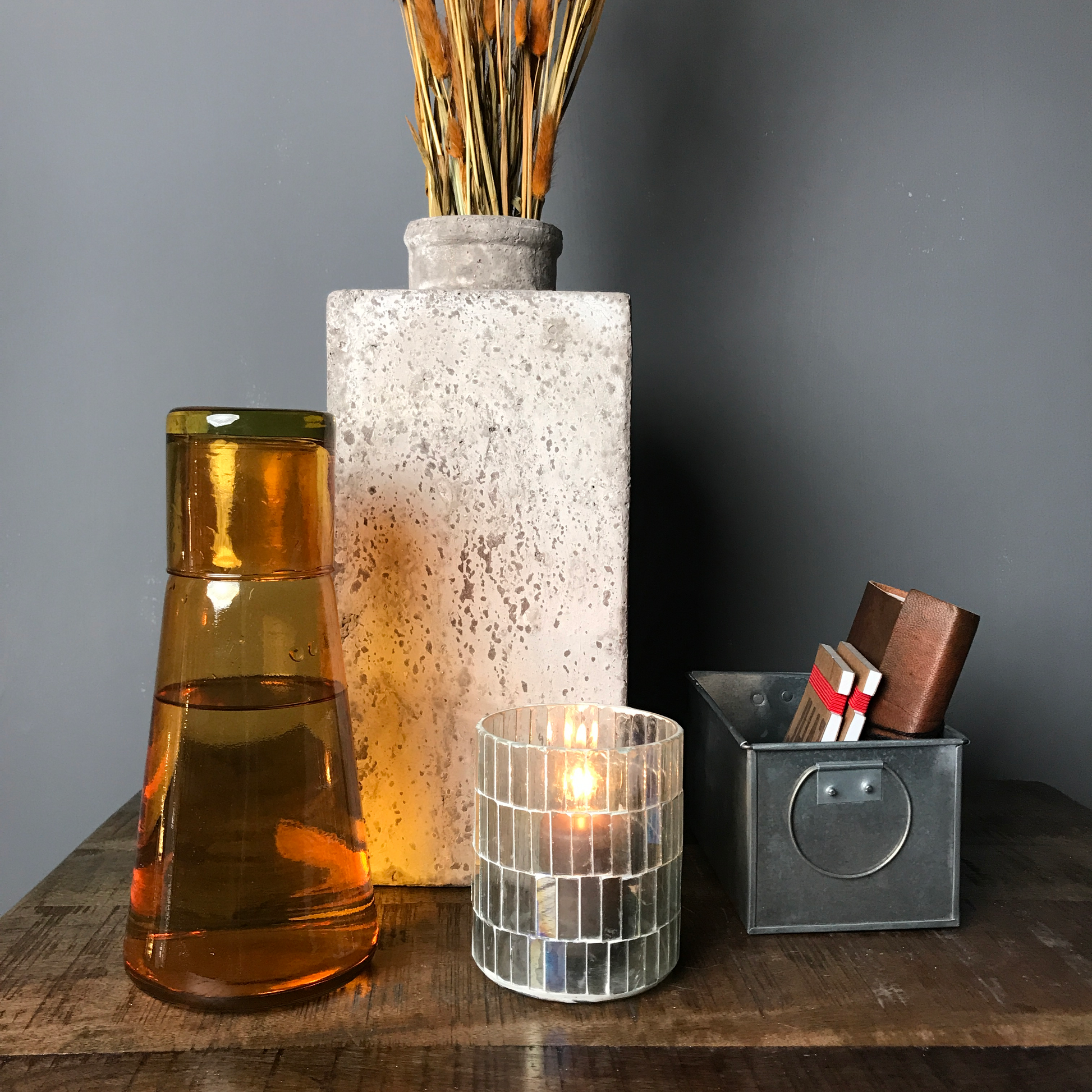 When a Spanish glass factory closed its doors for good we were able to scoop up a bunch of these beautiful carafes! They come complete with a glass that also acts as a lid and look beautiful together on your nightstand or next to your computer. Made of glass and dishwasher safe.