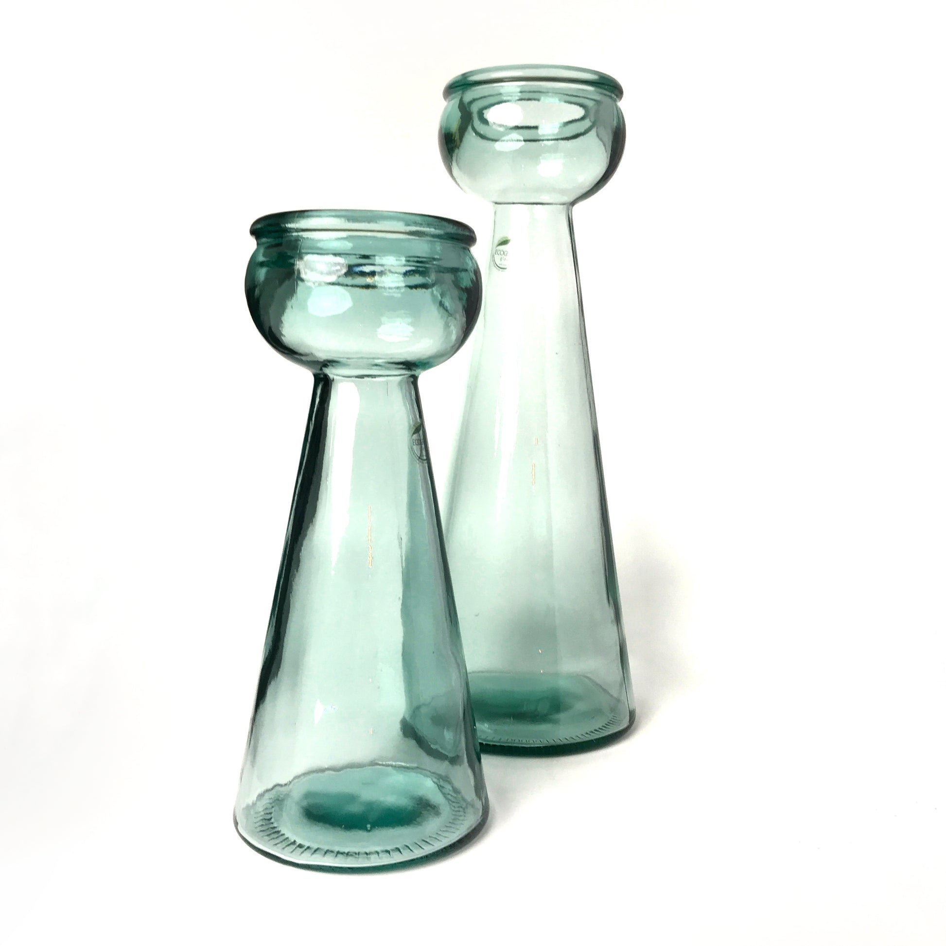 This uniquely shaped piece has a dual function -- it can be a candleholder or a flower vase. Made in Spain of recycled glass, it has a clear slightly green tinted color that is fresh and clean, ideally suited to any style of decor. Comes in two sizes, 30cm and 40cm tall.
