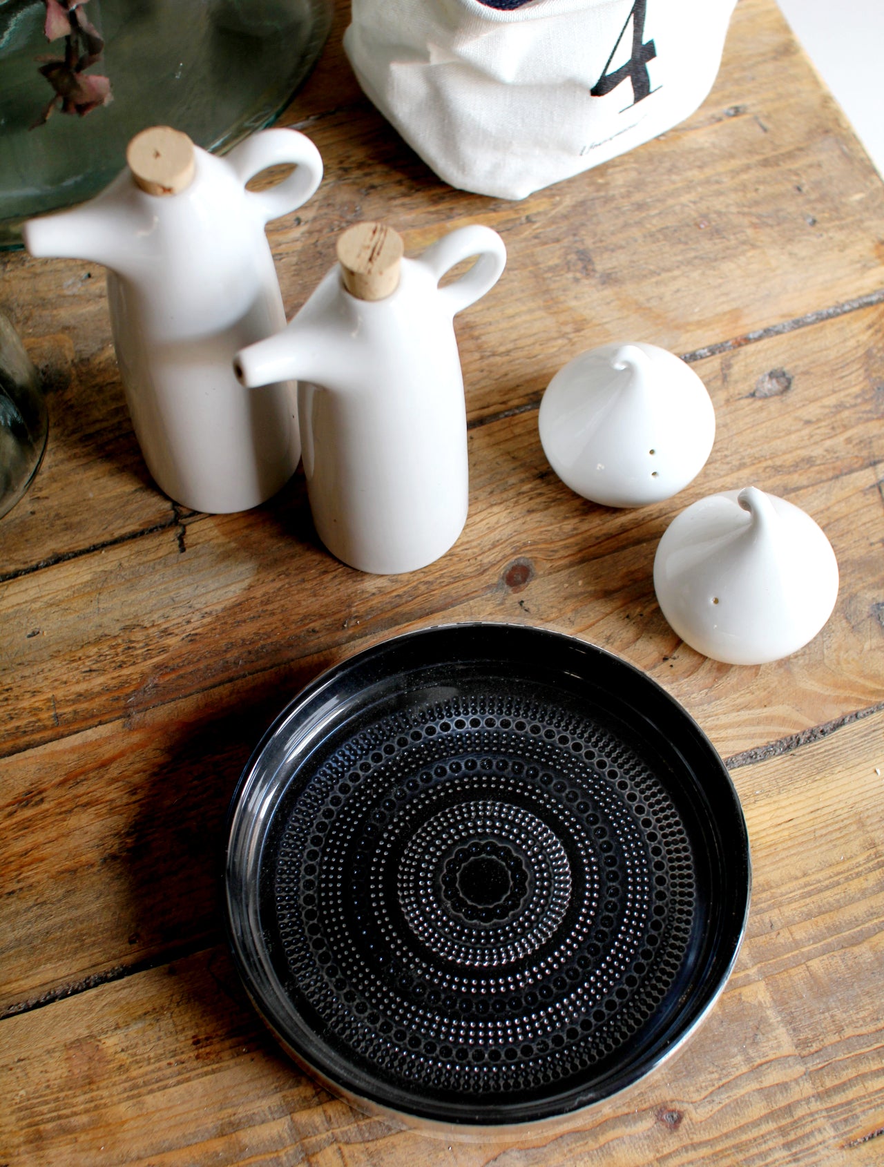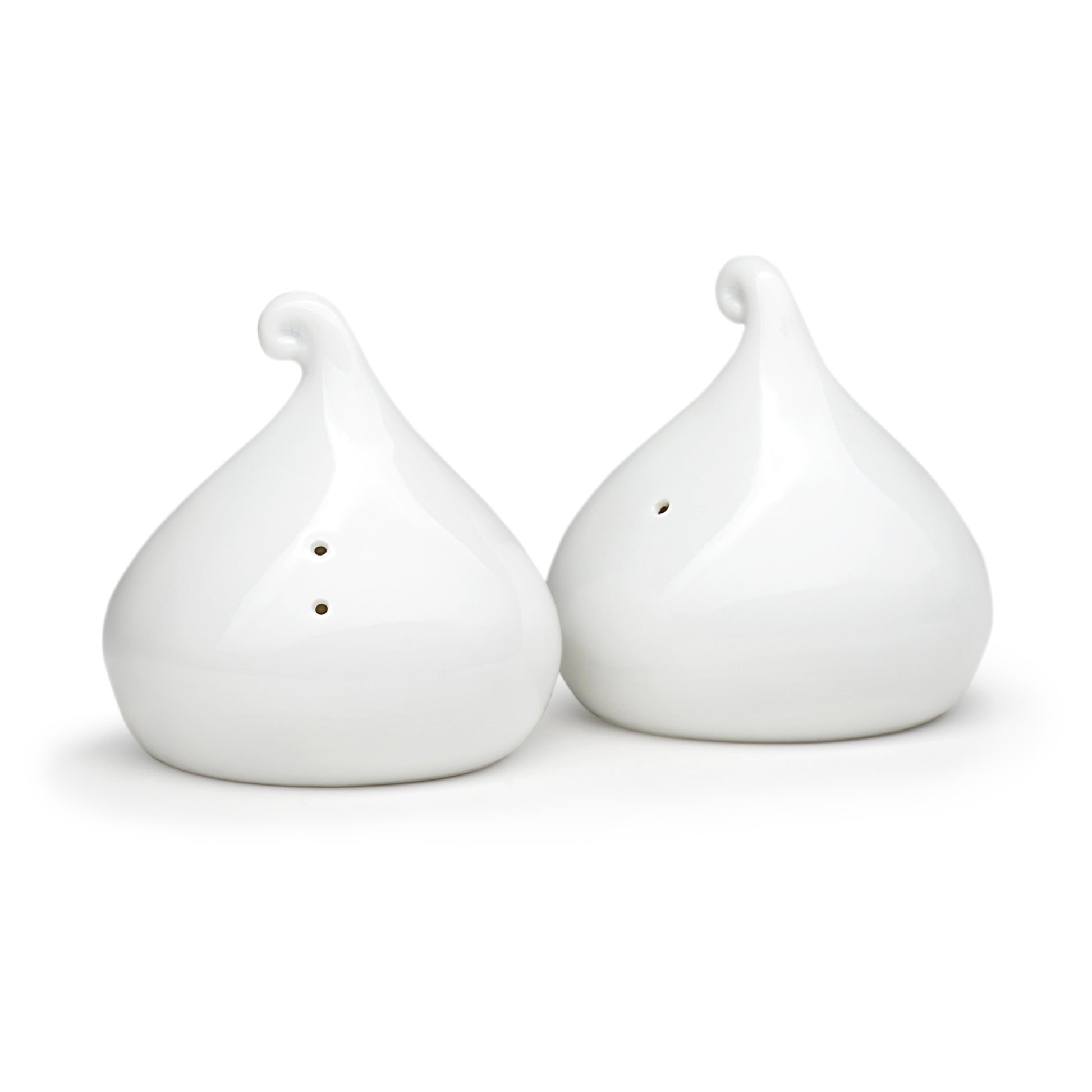 A swirly pair of salt and pepper kisses in glossy white porcelain.
