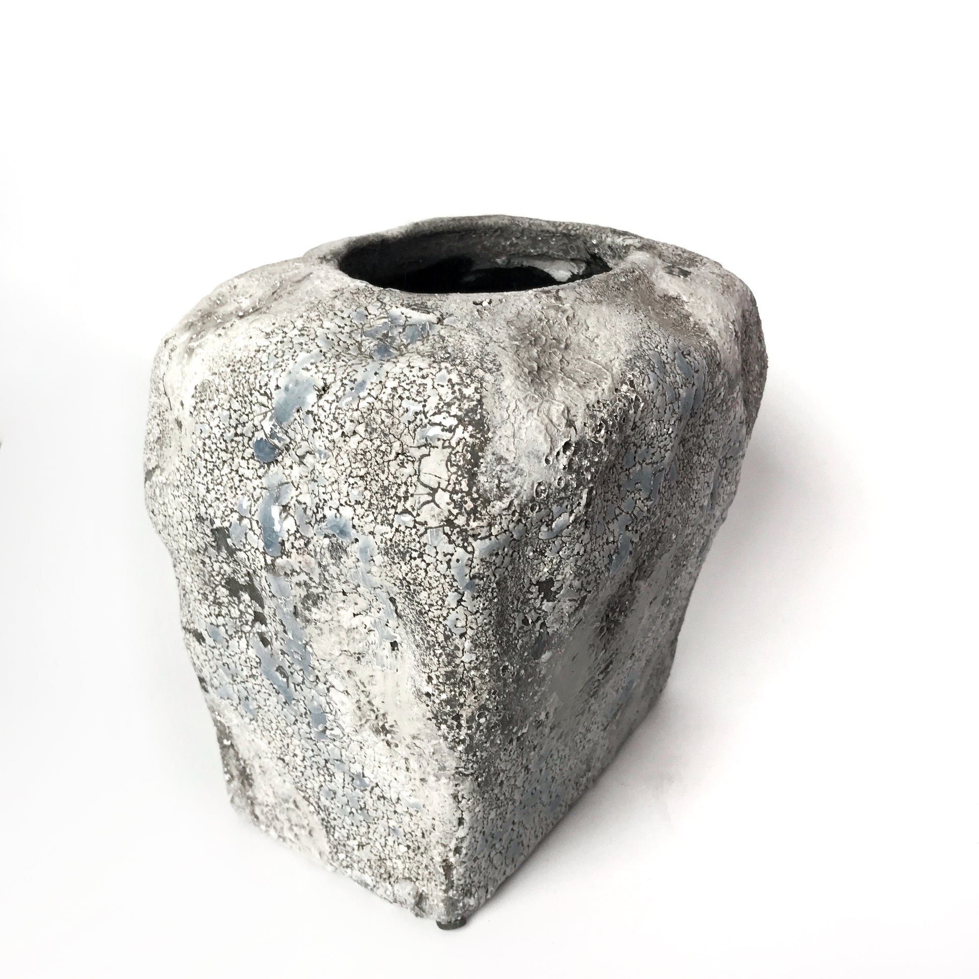 There's something mesmerizing about this vase--maybe it's its unusual squat shape or the rough texture with just a hint of pale blue flecks. It looks like it's made of stone but it's not. It lends a dramatic touch to any decor, be it natural boho or minimal brutalist. It also looks great paired with its shorter version.