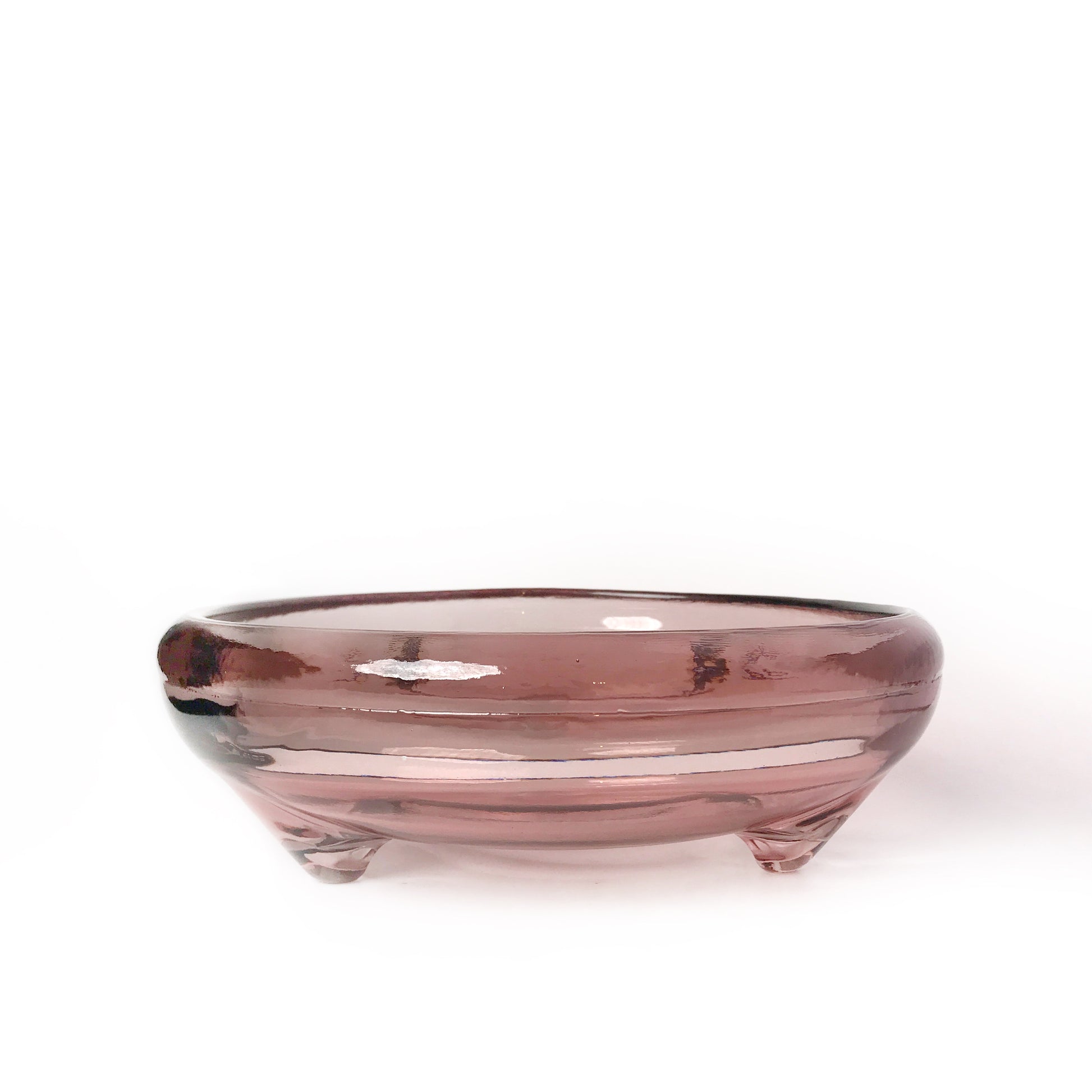 Like its fellow companions, this thick glass bowl has three feet and a bit of an industrial feel. Made of recycled glass in Valencia, Spain. it comes in three colors: rose, yellow and green.