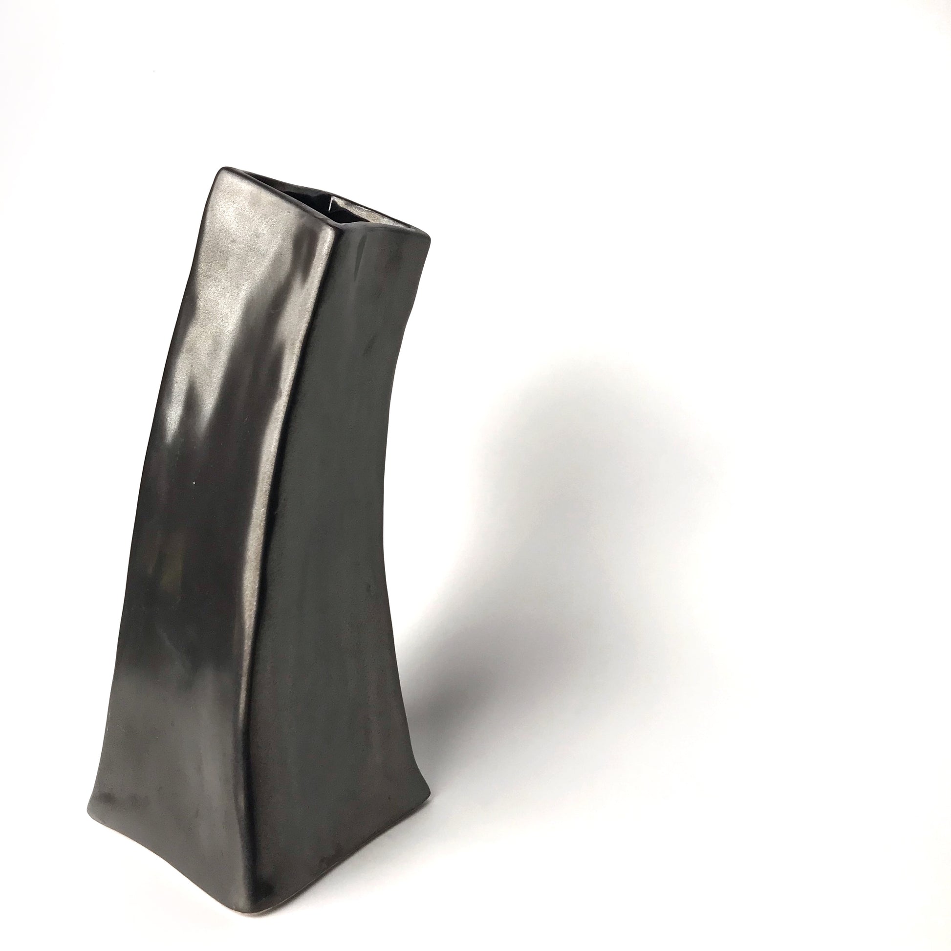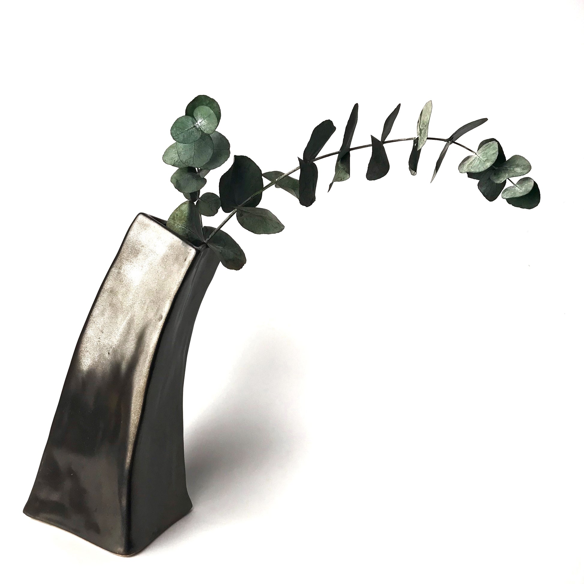 We can't resist a vase that's a little unusual and this one fits the bill. We love its unique tipsy personality and it has a really beautiful dark metallic grey finish. Very bold and gutsy for just the right setting. Made of ceramic.