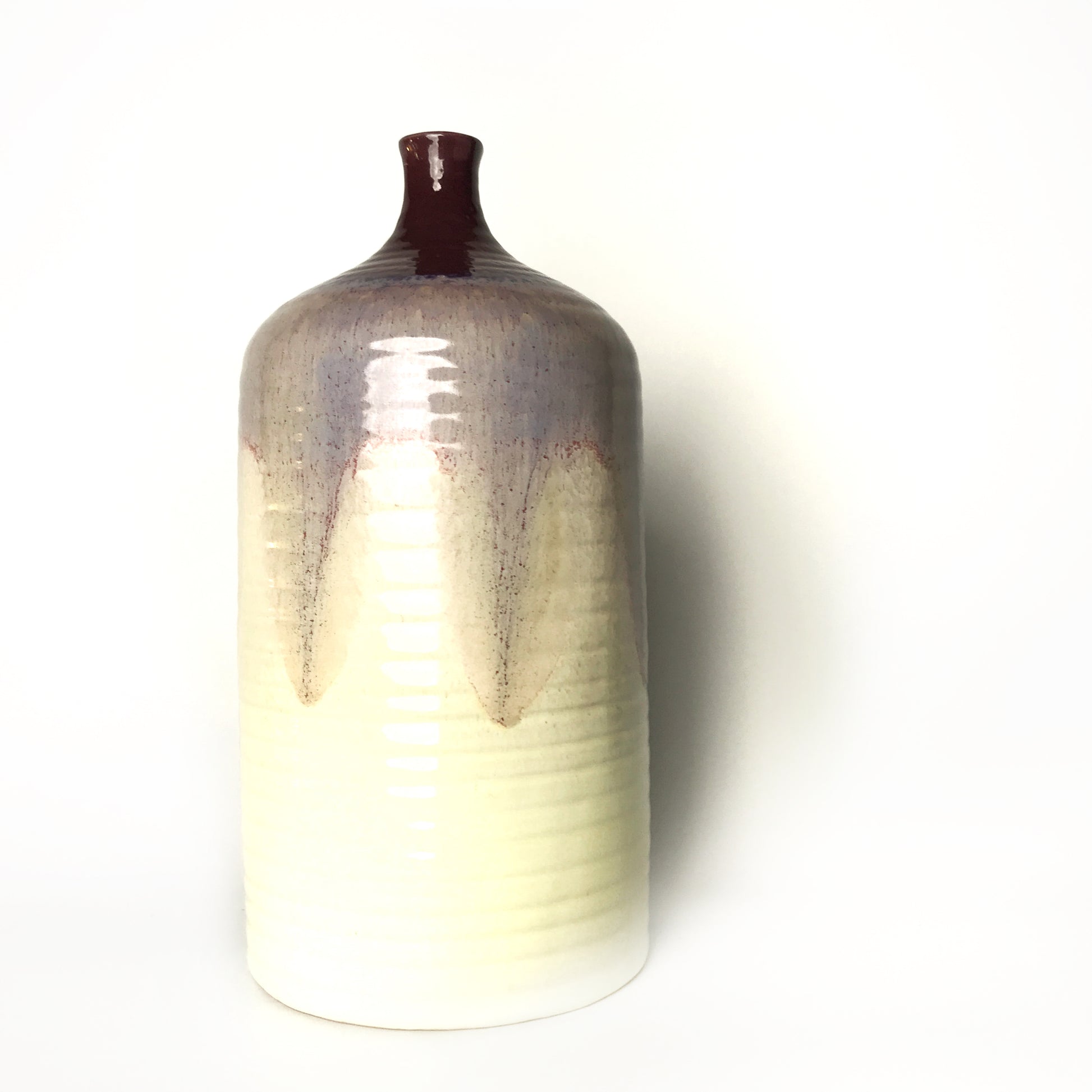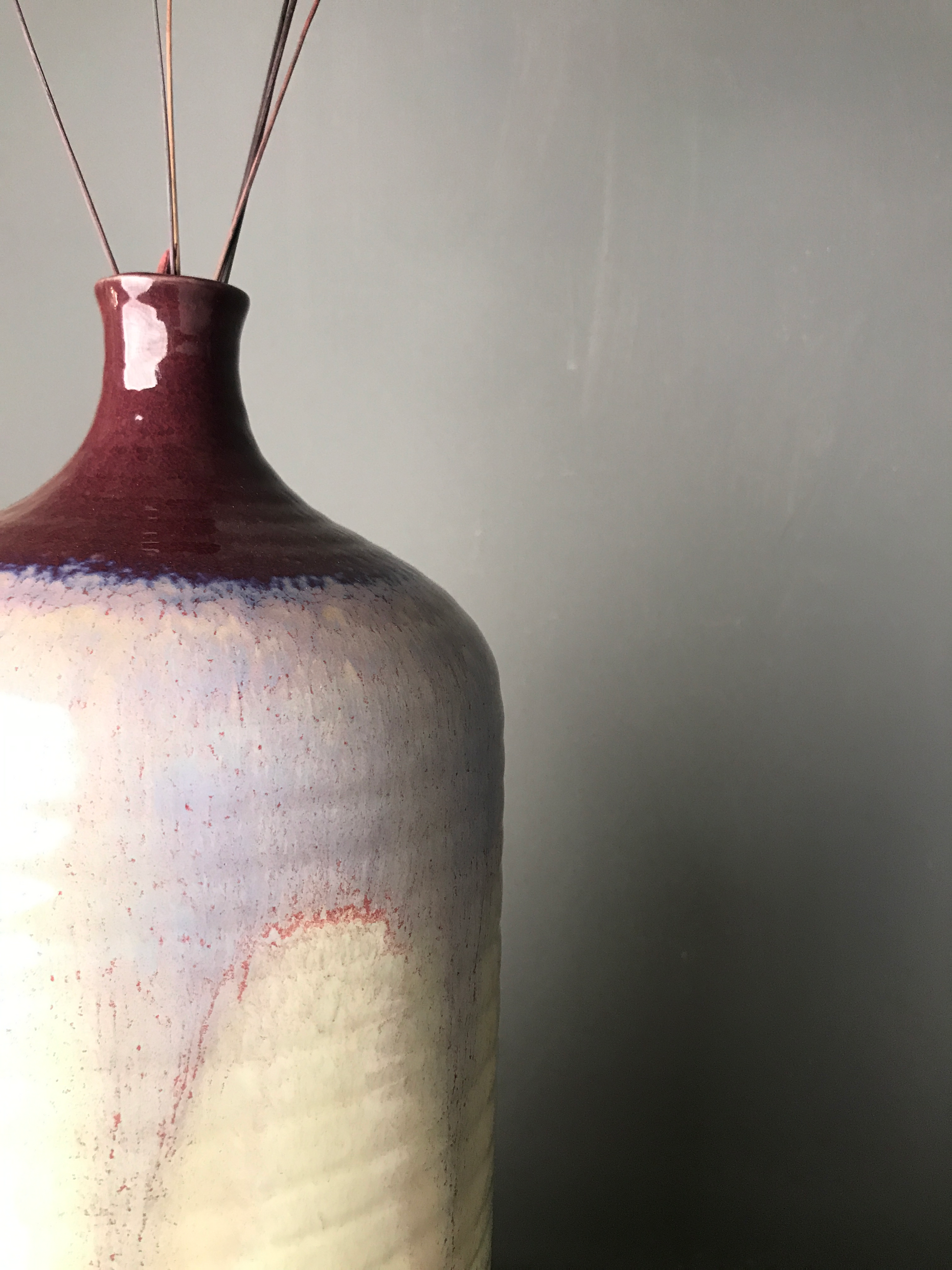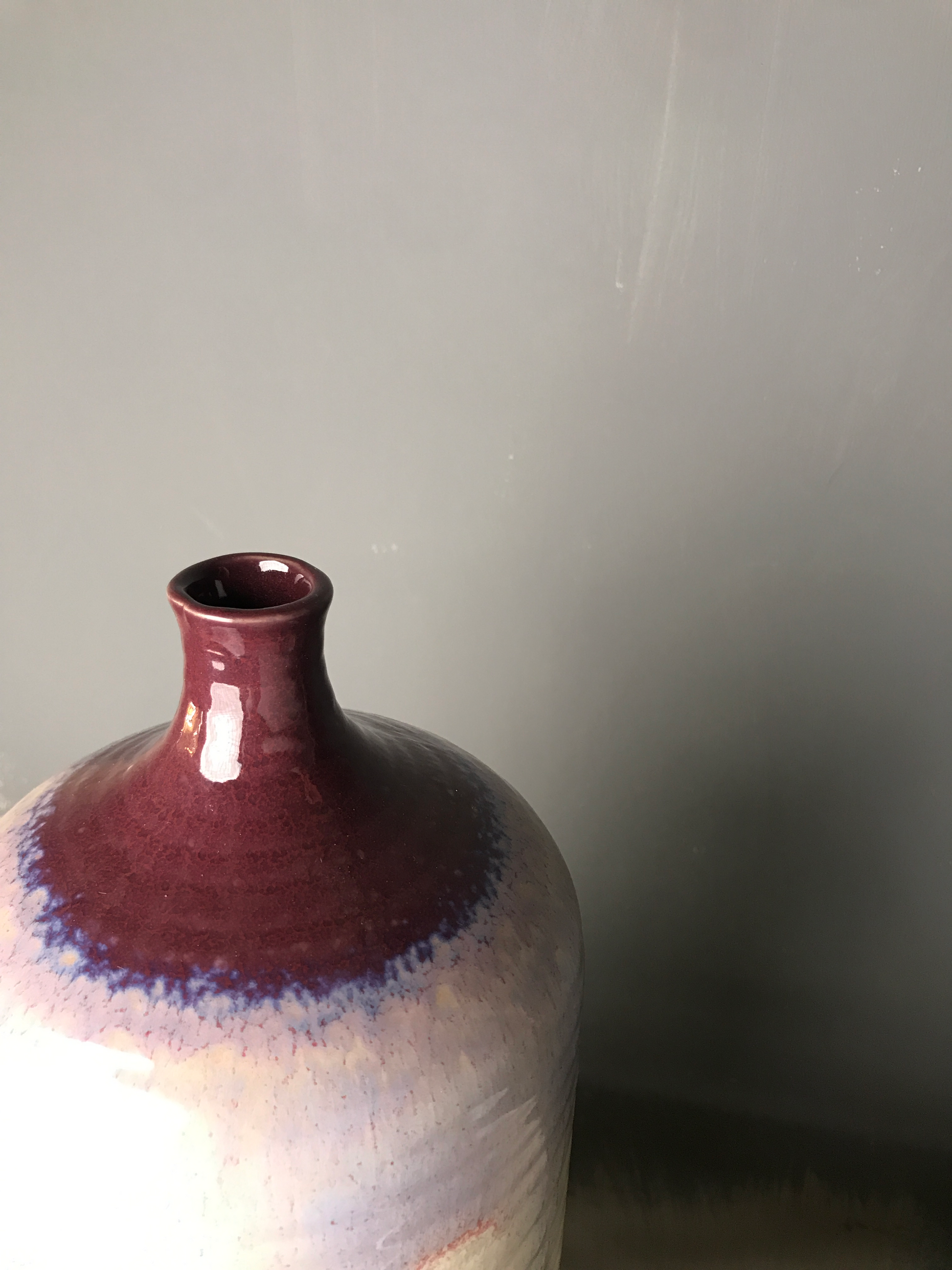 This slightly oversized vase has a really beautiful degraded colored finish, with colors that range from dark plum to bright blue to cream. It has a narrow spout so it can be placed alone to show off its sculptural shape. Or fill it with a single stem or several fine ones for a more dramatic look.