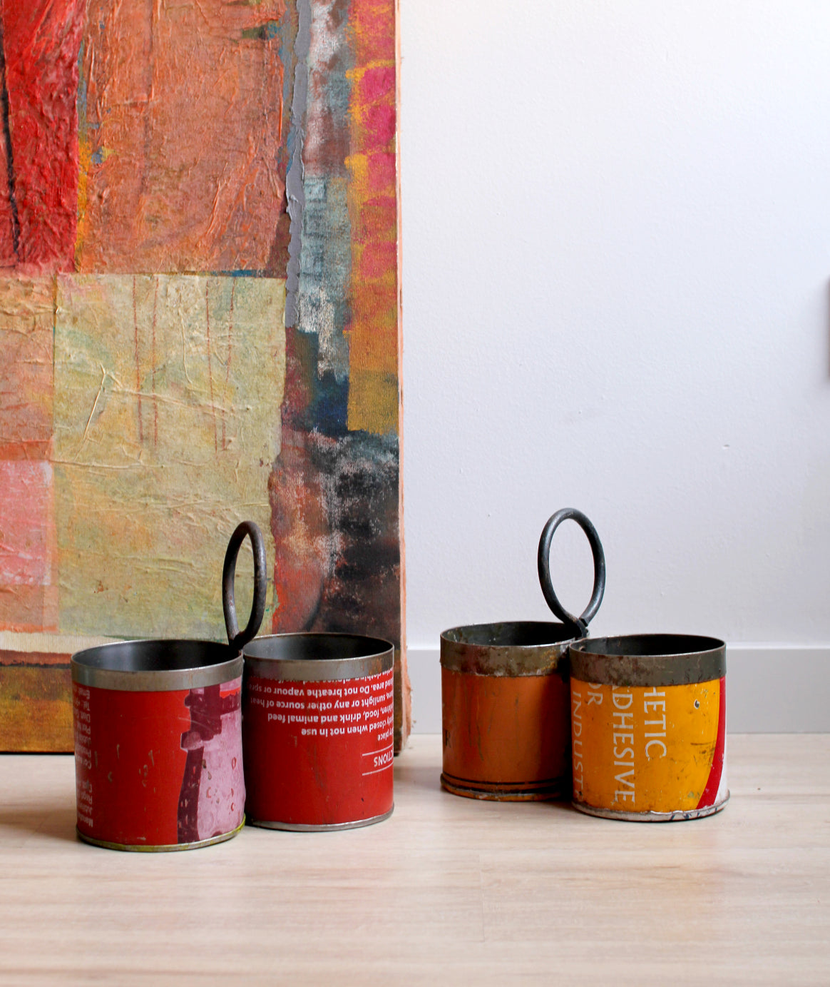 These unique storage containers are made from up-cycled metal and take their inspiration from vegetable cup holders used in restaurants in India. They are great for storing silverware in the kitchen or pens on a desk. They are colourful and unique as no two look alike.