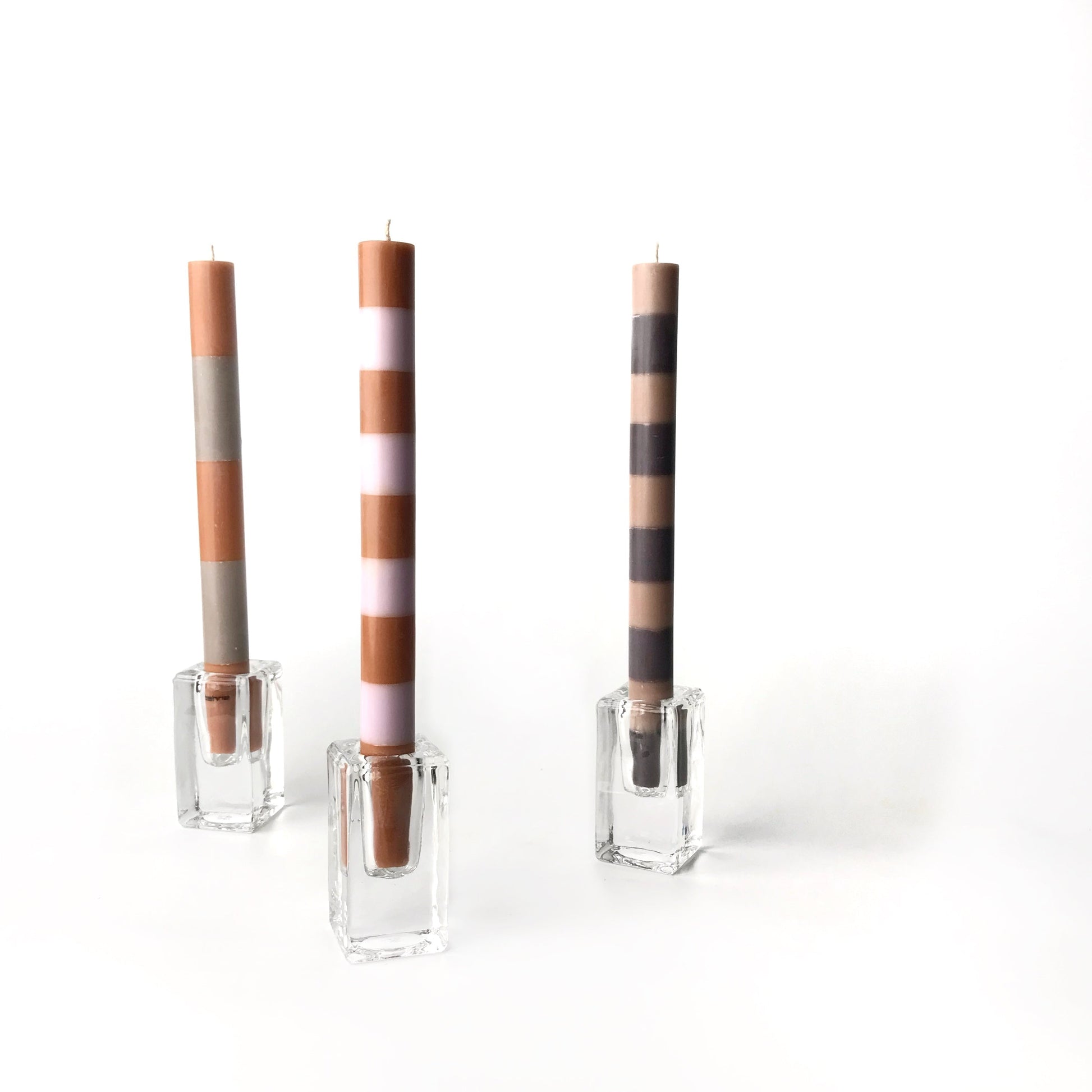 We have three styles of this distinctive striped candle--ocher/sand and ocher/rose and beige/dark grey. Ocher/Sand is on the left side of the main photo. Great for adding an original decorative touch to your dining table or living room. For a minimalist touch, they look great paired with our Simple Glass Candeholder. They burn for 8 hours and are dripless. Comes as set of four candles.