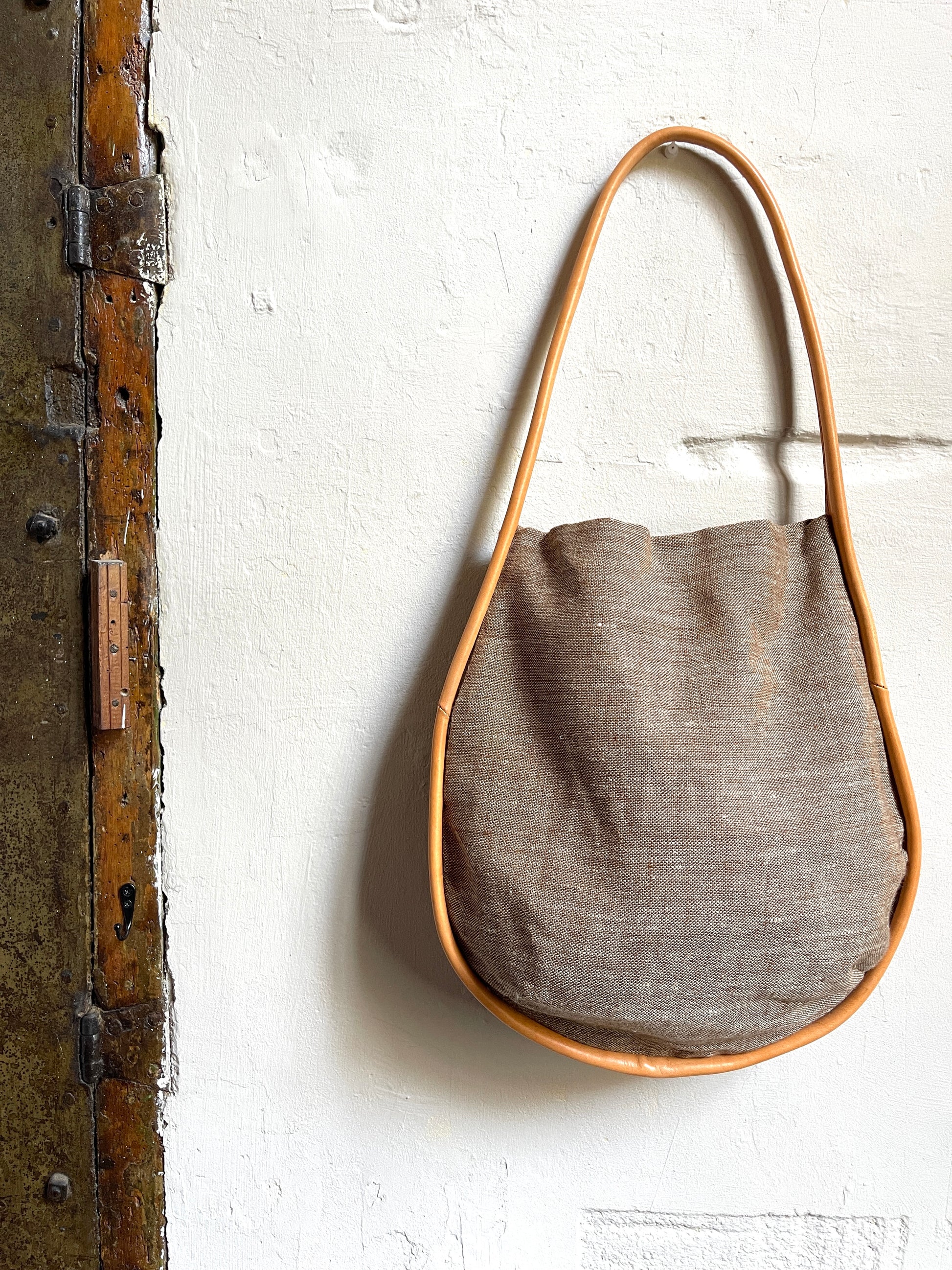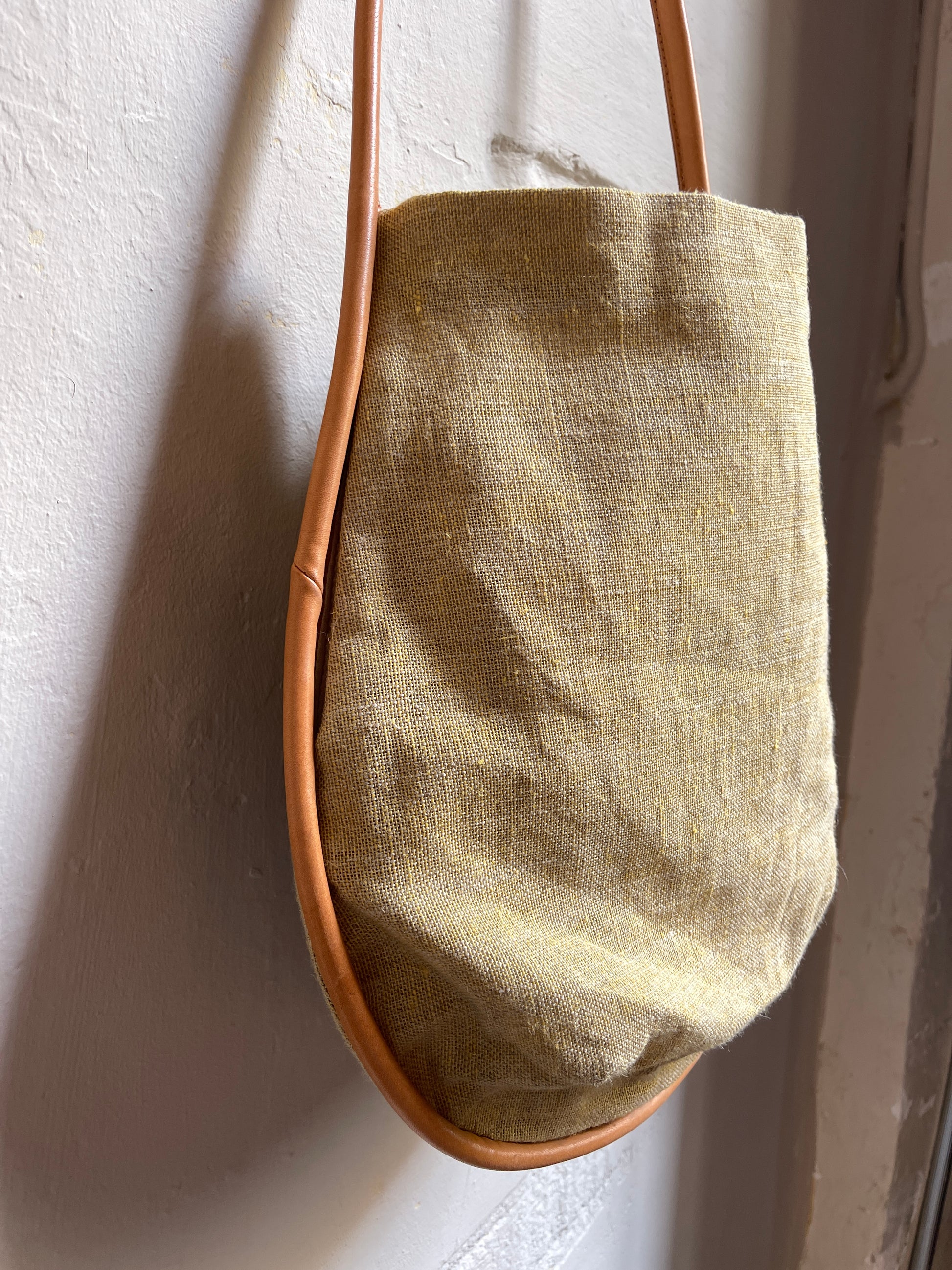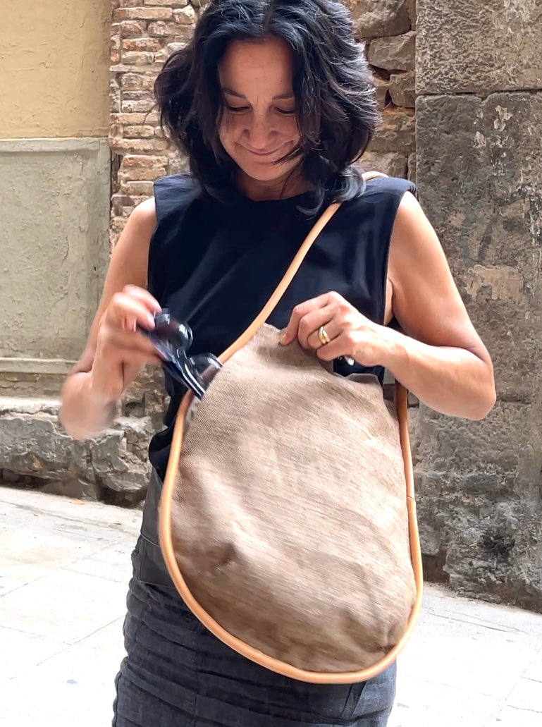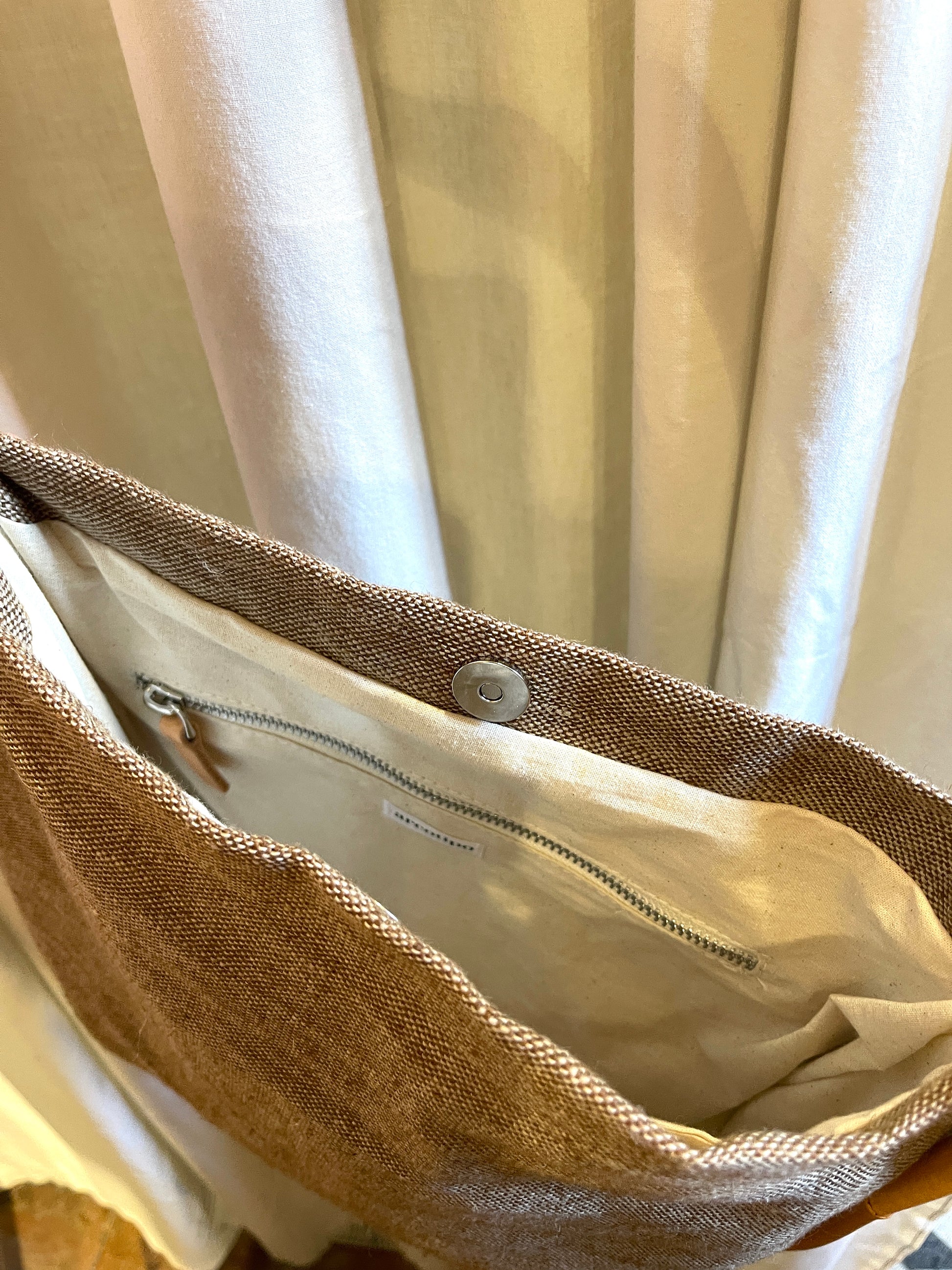 Made of leather and a lovely textured linen, this bag has a magnetic closure, two inner pockets (one with zipper) and a hidden outer pocket that can hold your keys, phone or wallet.