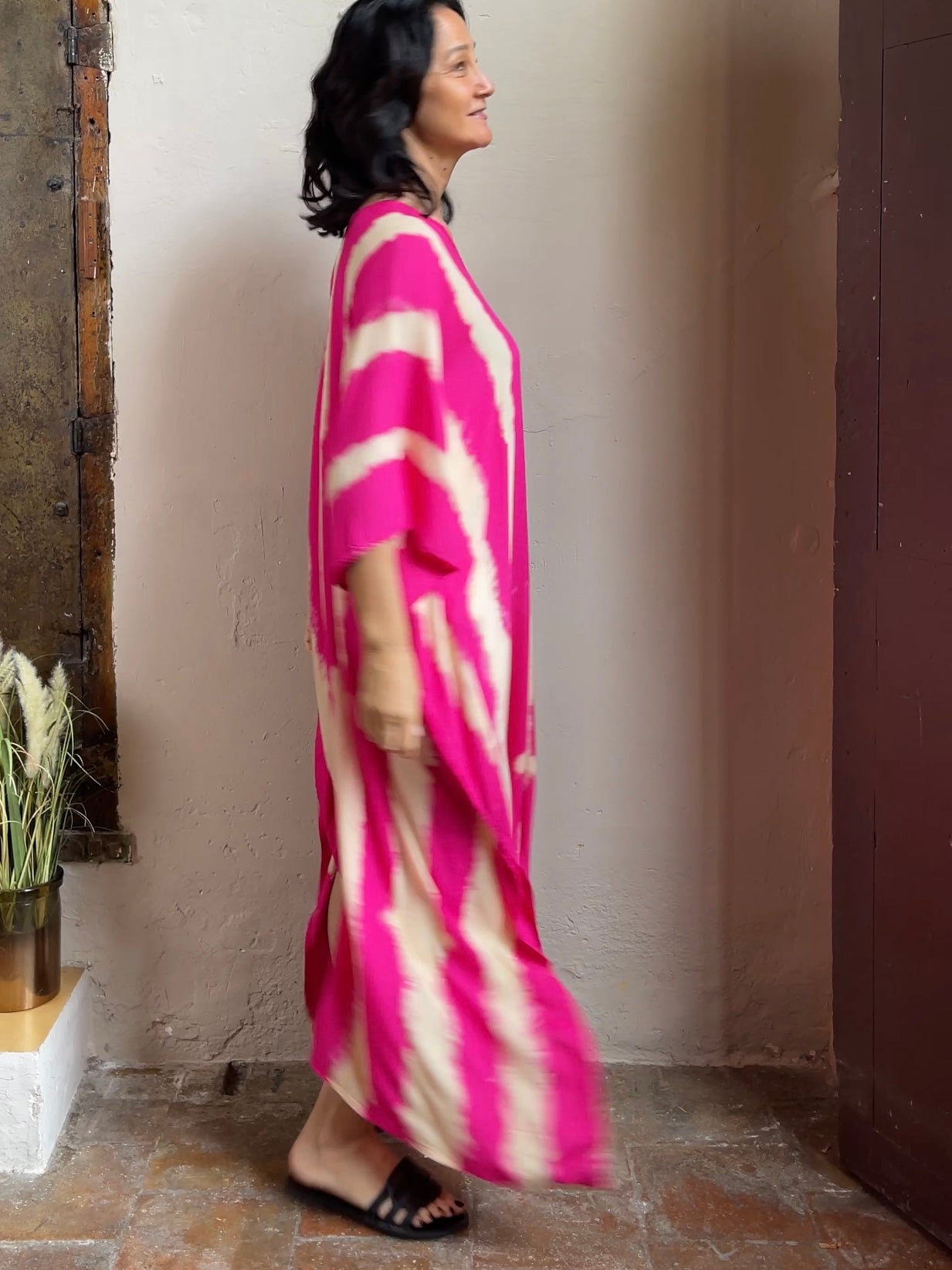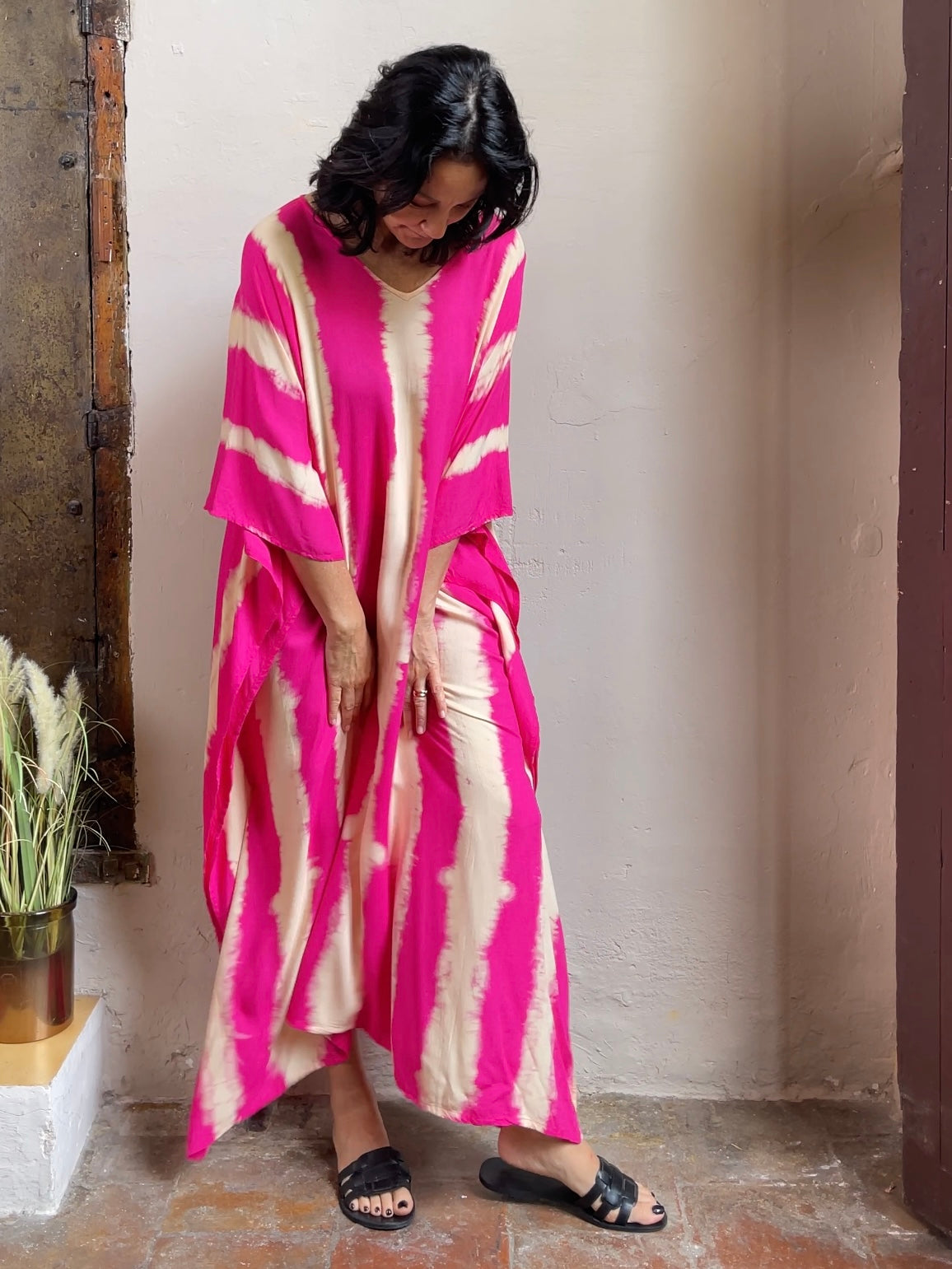 You'll feel like a goddess in these elegant kaftans. Your body feels light and free underneath as the soft rayon fabric flows ever so gently. Hand-tie-dyed with care by a small family-run production in Thailand, the colors and patterns are unique on each piece. They are one size fits all. The model in the video is 175cm/5ft.9in