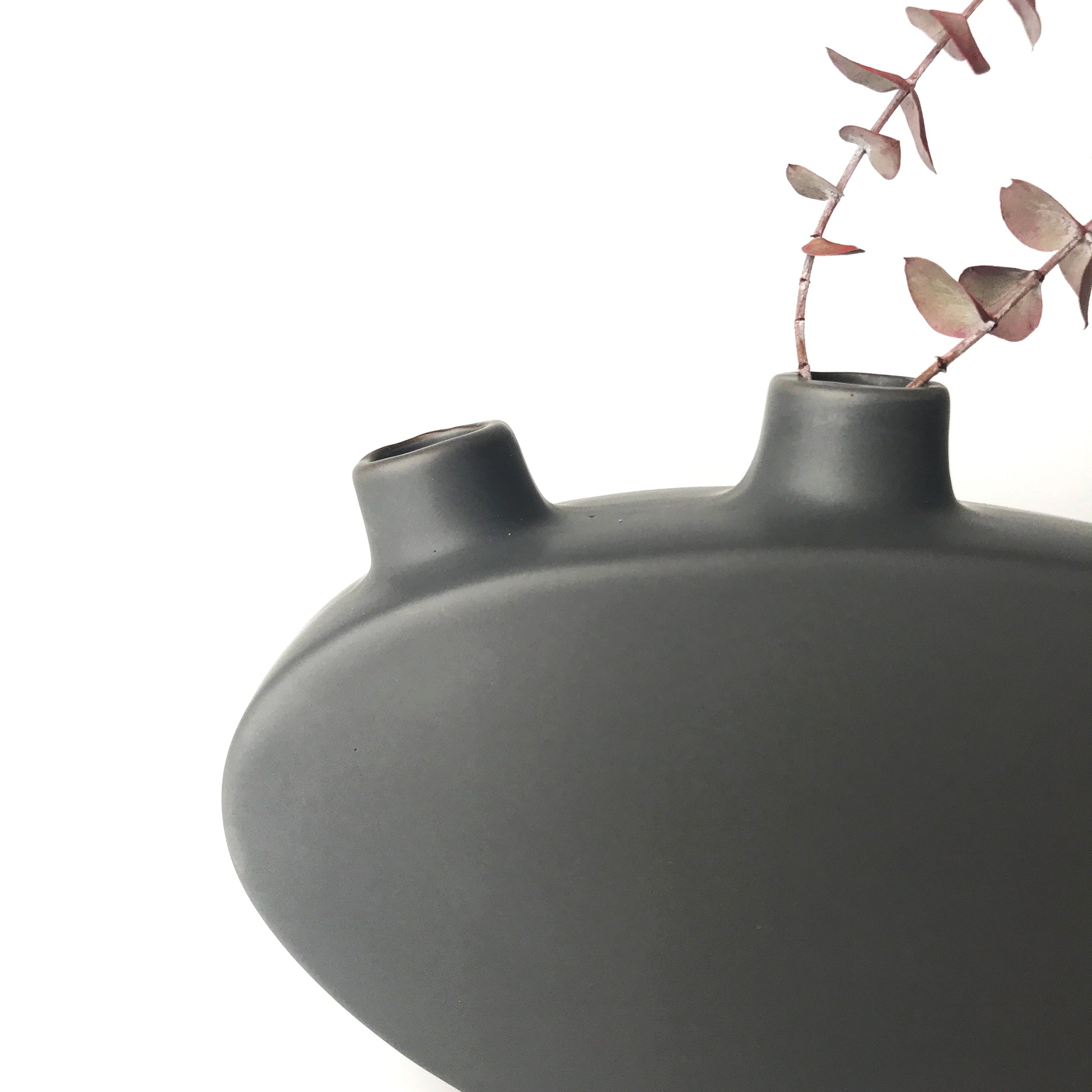 The striking shape of this vase gives it a sculptural quality that looks intriguing on its own--add a small branch or flowers and it becomes all the more appealing. Made of ceramic, it comes in matte dark grey or a glossy beige. Dimensions: 5.5 x 20 x 13 cm H